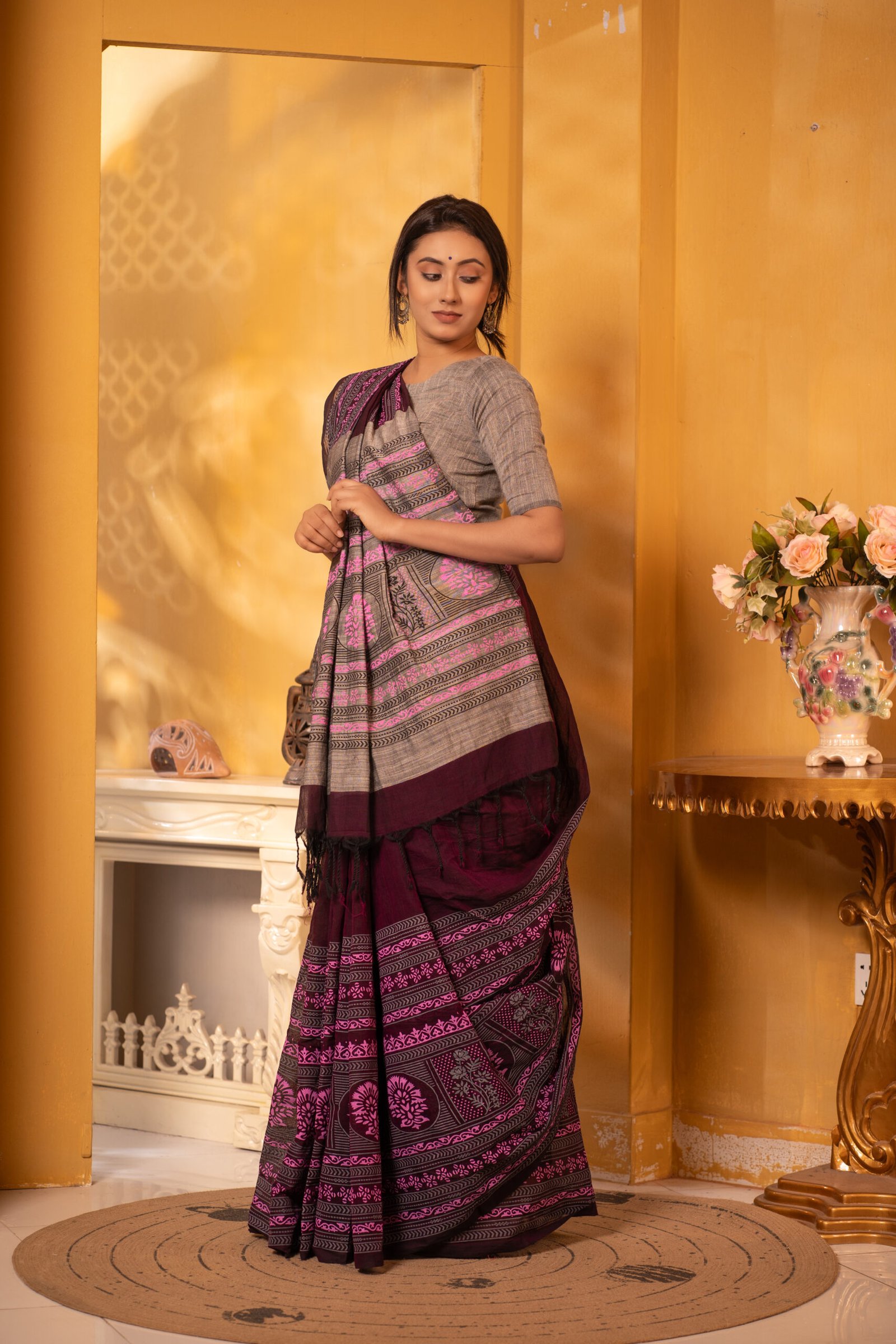 এন্ডি কটন শাড়িতে স্ক্রিন প্রিন্ট করা সুন্দর ও বেশ আরামদায়ক। আঁচলে এন্ডি সুতা এবং জামিনে কটন সুতা দিয়ে হ্যান্ডলুম তাঁতে বুনা শাড়ি ।