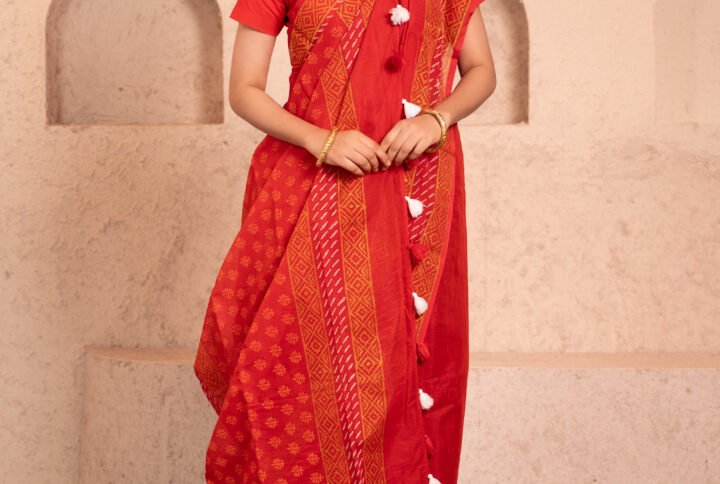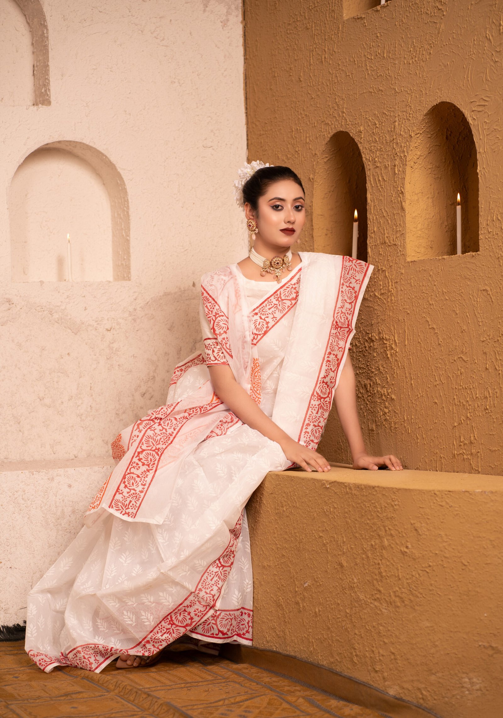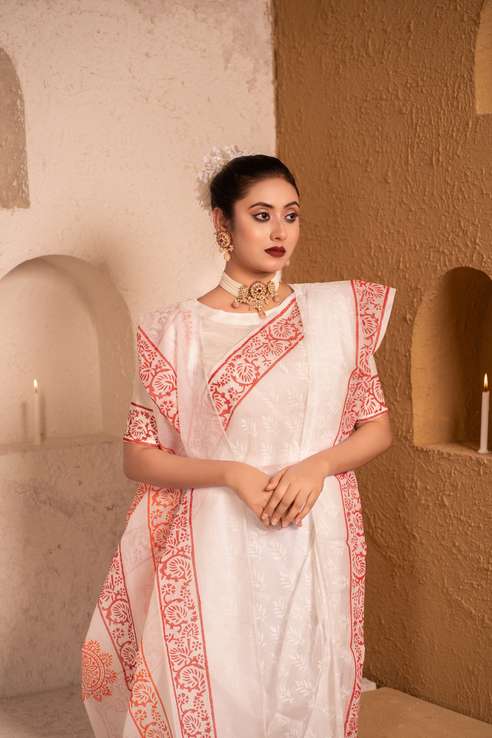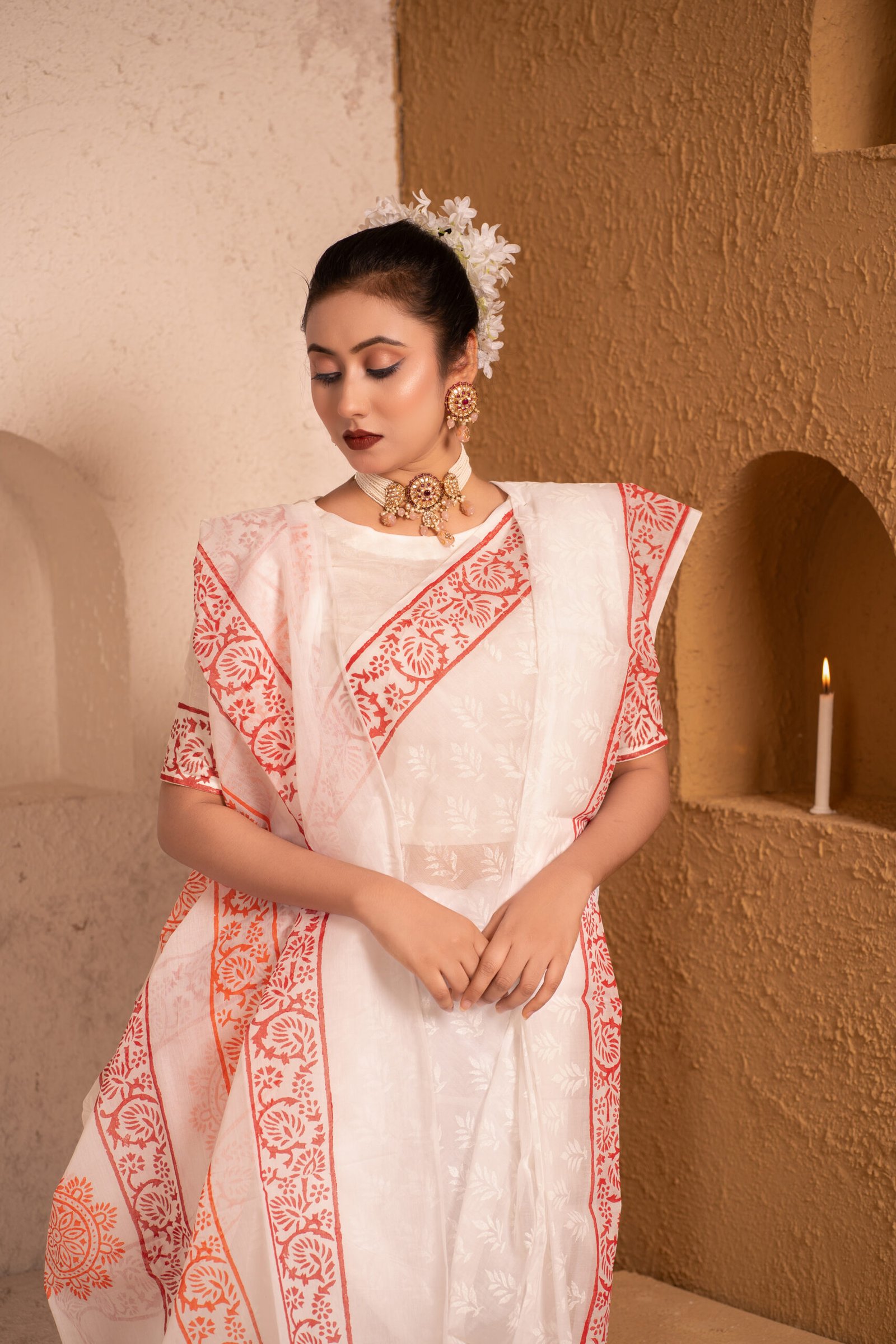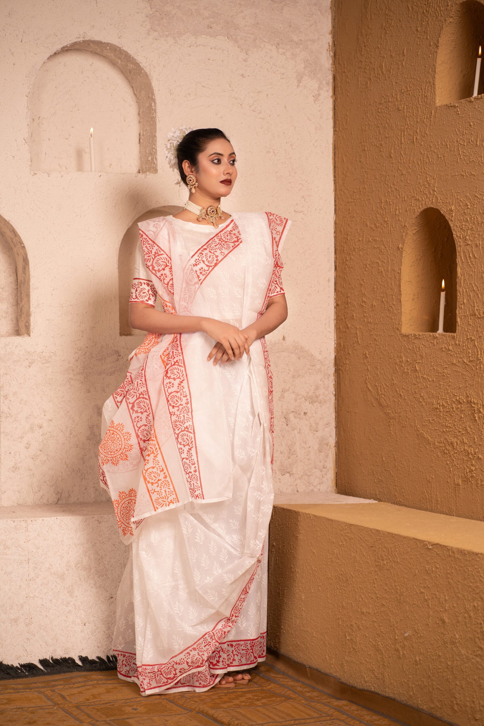 সেমি মসলিন কাপড়ে ব্লক প্রিন্ট করা শাড়ি সুন্দর ও বেশ আরামদায়ক।